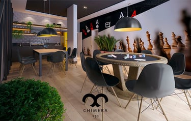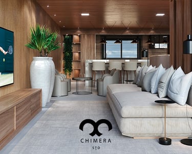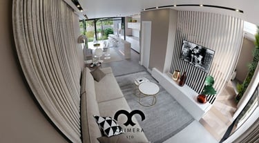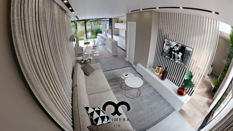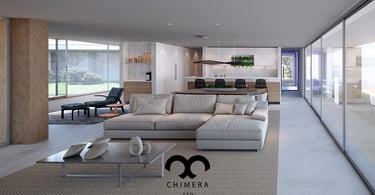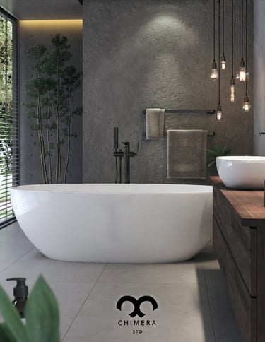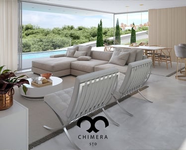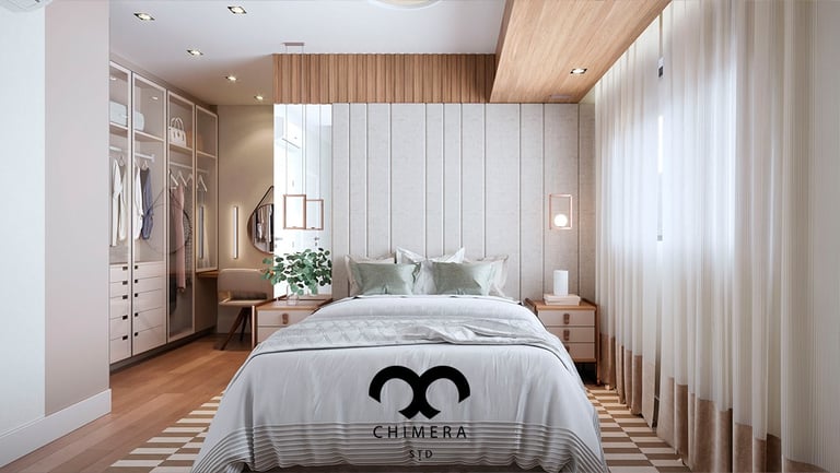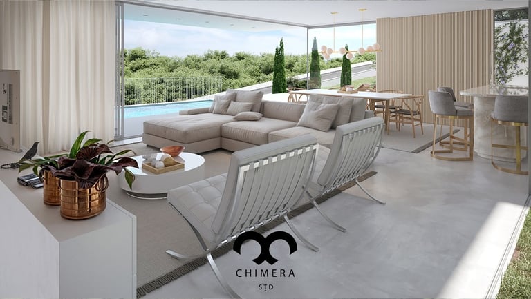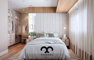 Essa imagem demonstra a qualidade realista de renderizações de design de interiores, que podem ser usadas para visualizações arquitetônicas ou marketing imobiliário, através de uma atmosfera serena.