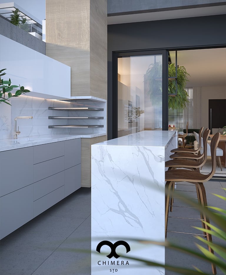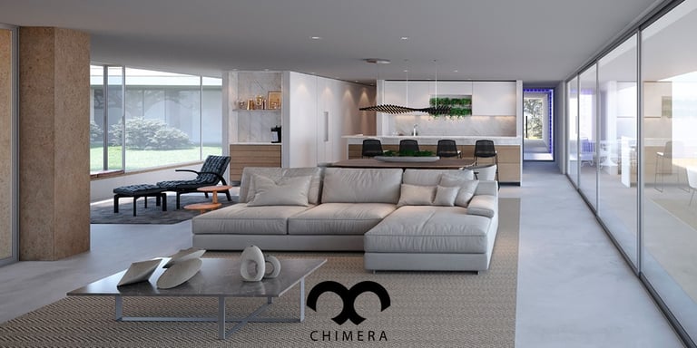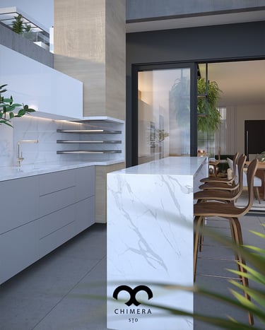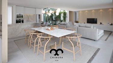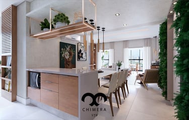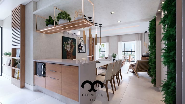 Imagem ultrarrealista que transmite harmonia e funcionalidade na integração entre cozinha e sala de jantar e estar.