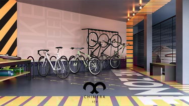 Espaço para bicicletas e oficina com estilo urbano.