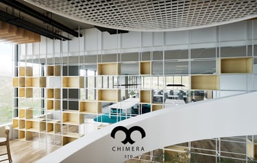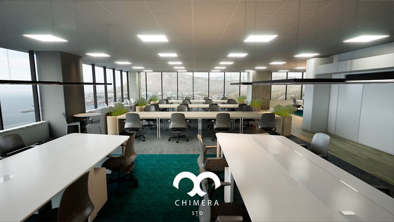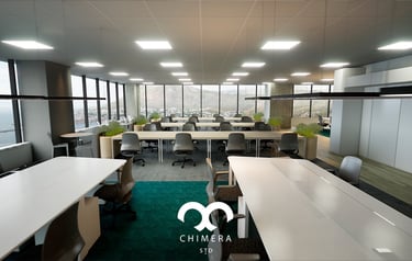 Ambiente corporativo moderno com layout de escritório aberto.