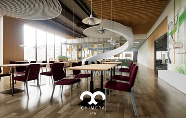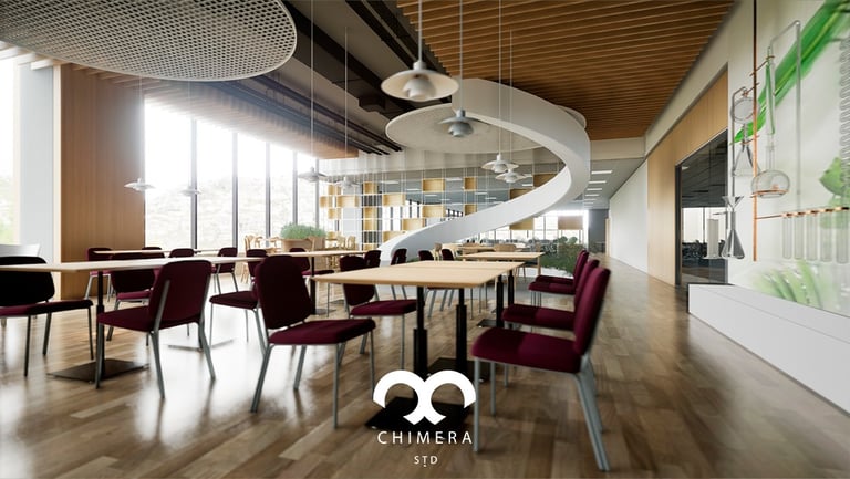Área de refeições coletivas em empreendimento corporativo.