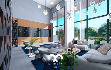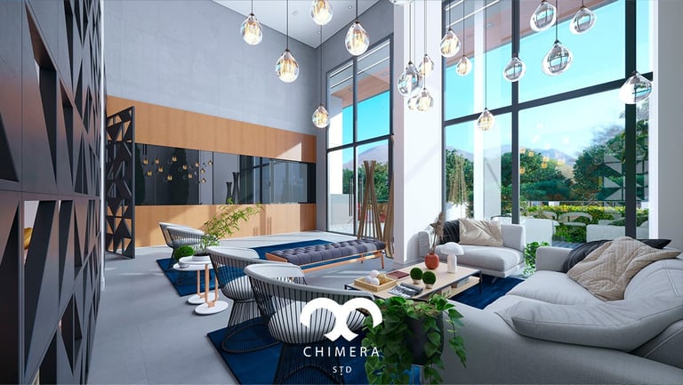 Imagem retratando uma sala de estar moderna e elegante em uma área comum de um edifício residencial.