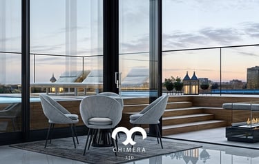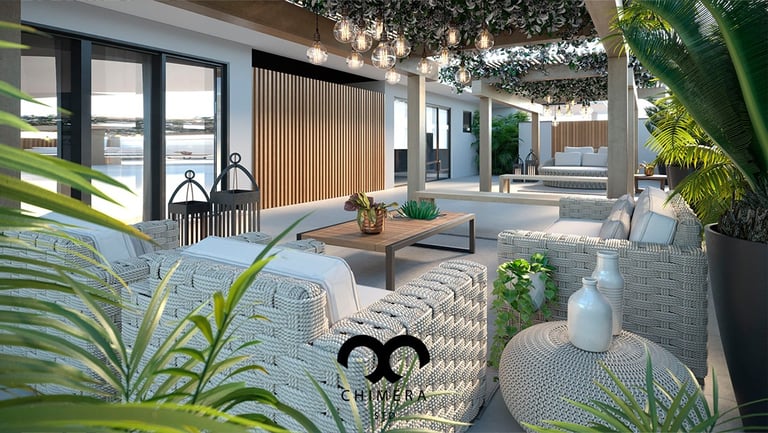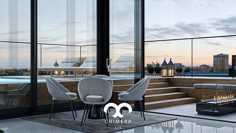 Imagem retrata uma área de estar luxuosa em um apartamento ao lado uma piscina no terraço oferecendo uma vista panorâmica da cidade.