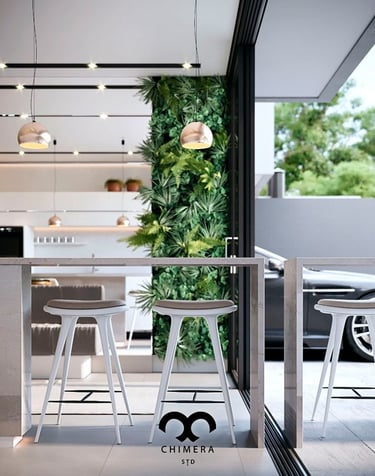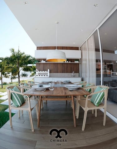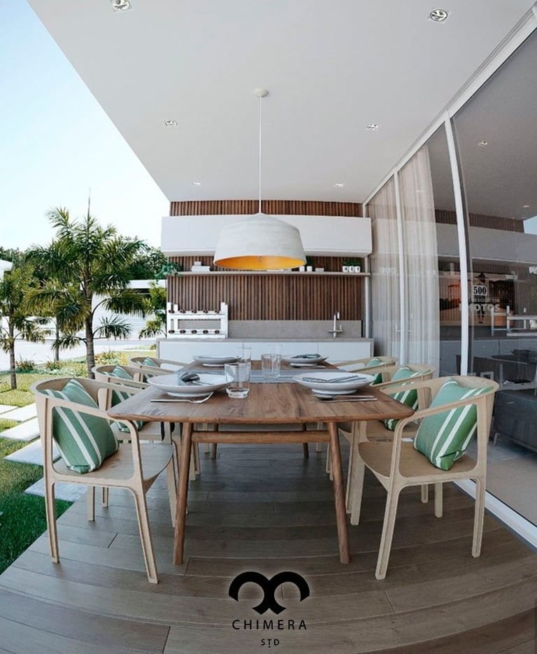 Representação de uma varanda gourmet convidativa, ideal para criar momentos inesquecíveis possibilitando a visualização e o potencial da uma residência.