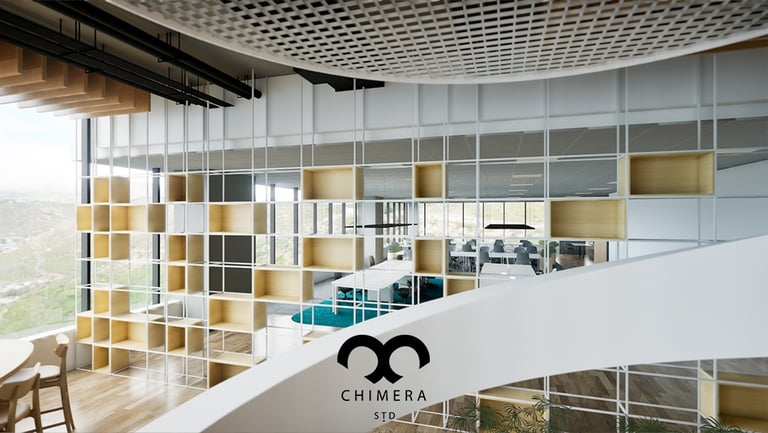Detalhe de um escritório corporativo, destacando a harmoniosa mistura de elementos de design.