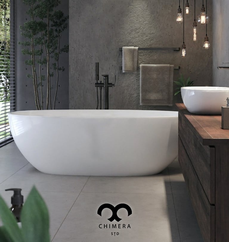 Banheiro moderno e elegante, com design minimalista e tons neutros.